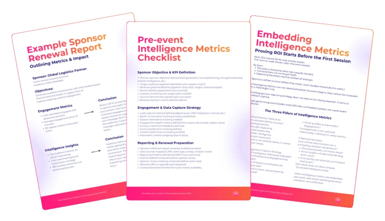 Proving ROI starts before the first session, yet most reports fail because the metrics were chosen after the event ended. This 10-page guide outlines how to move from reactive reporting to a strategic renewal narrative using the behavioral signals and audience intent captured during your live sessions. Download the guide to see how to convert engagement into the intelligence metrics that sponsors actually care about.